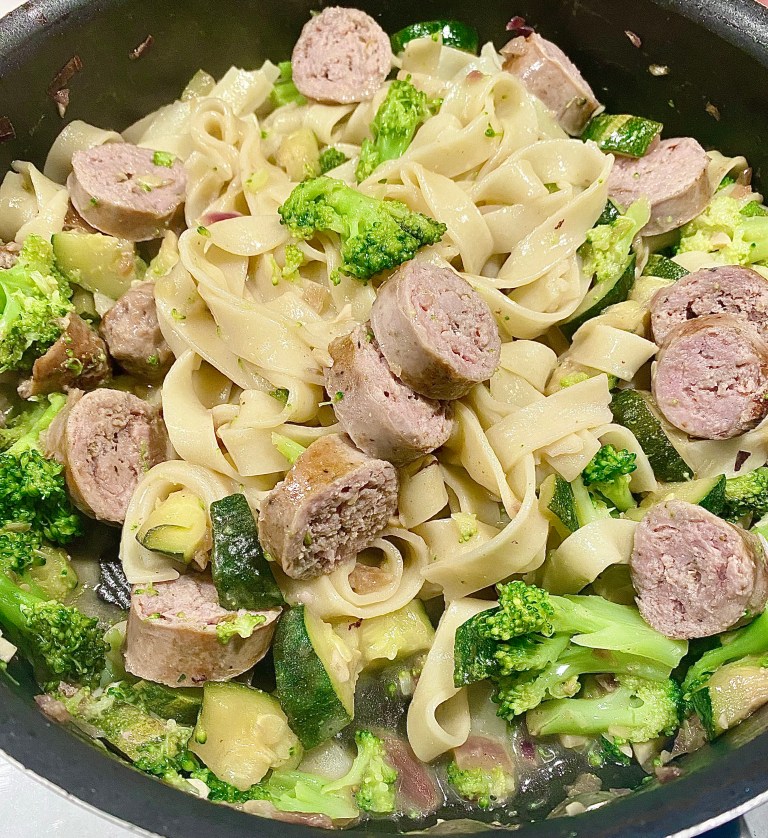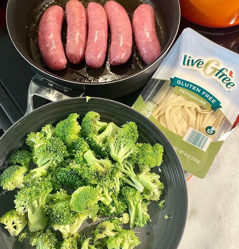 While sausages are cooking, add broccoli florets into the boiling water until almost cooked (crispy and green) and with the last 90 seconds, add the pasta. Cook, then strain. (Reserve 1/2 cup cooking water or so.)