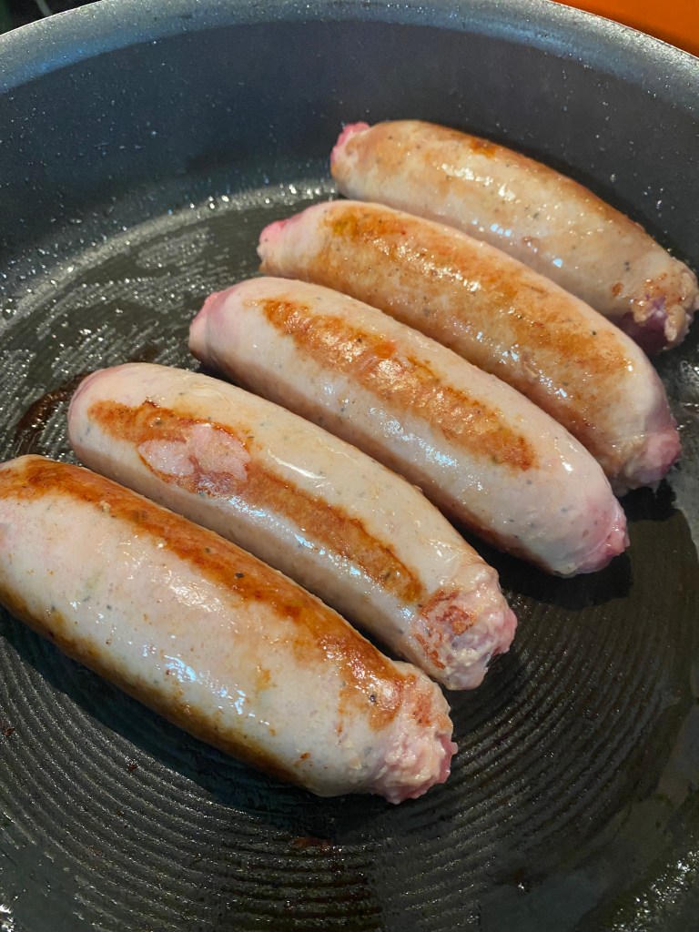 In a medium sauté pan, add olive oil. Add sausage links and sear all sides. Add 1/4 cup white wine (or beer or water), cover and allow sausages to cook through.