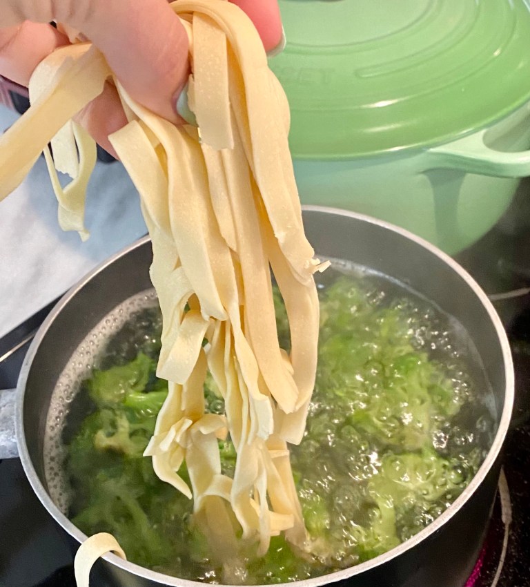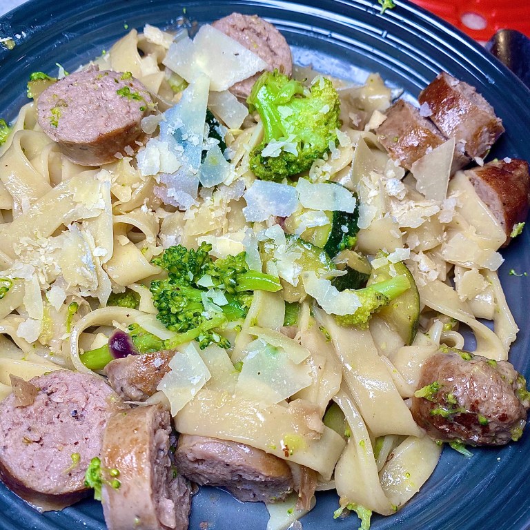 This gluten-free pasta dish, is a simple, healthy weeknight meal for your family. It’s also super interchangeable if you’re having one of those “What’s in the fridge” nights! Change out fresh broccoli for frozen, skip the zucchini completely, use ground meat, etc. (And of course, you don’t have to use fresh or gluten-free pasta.) I do think there is just something about fresh pasta, and when you find it gluten-free (for your intolerant husband) you must pick some up!