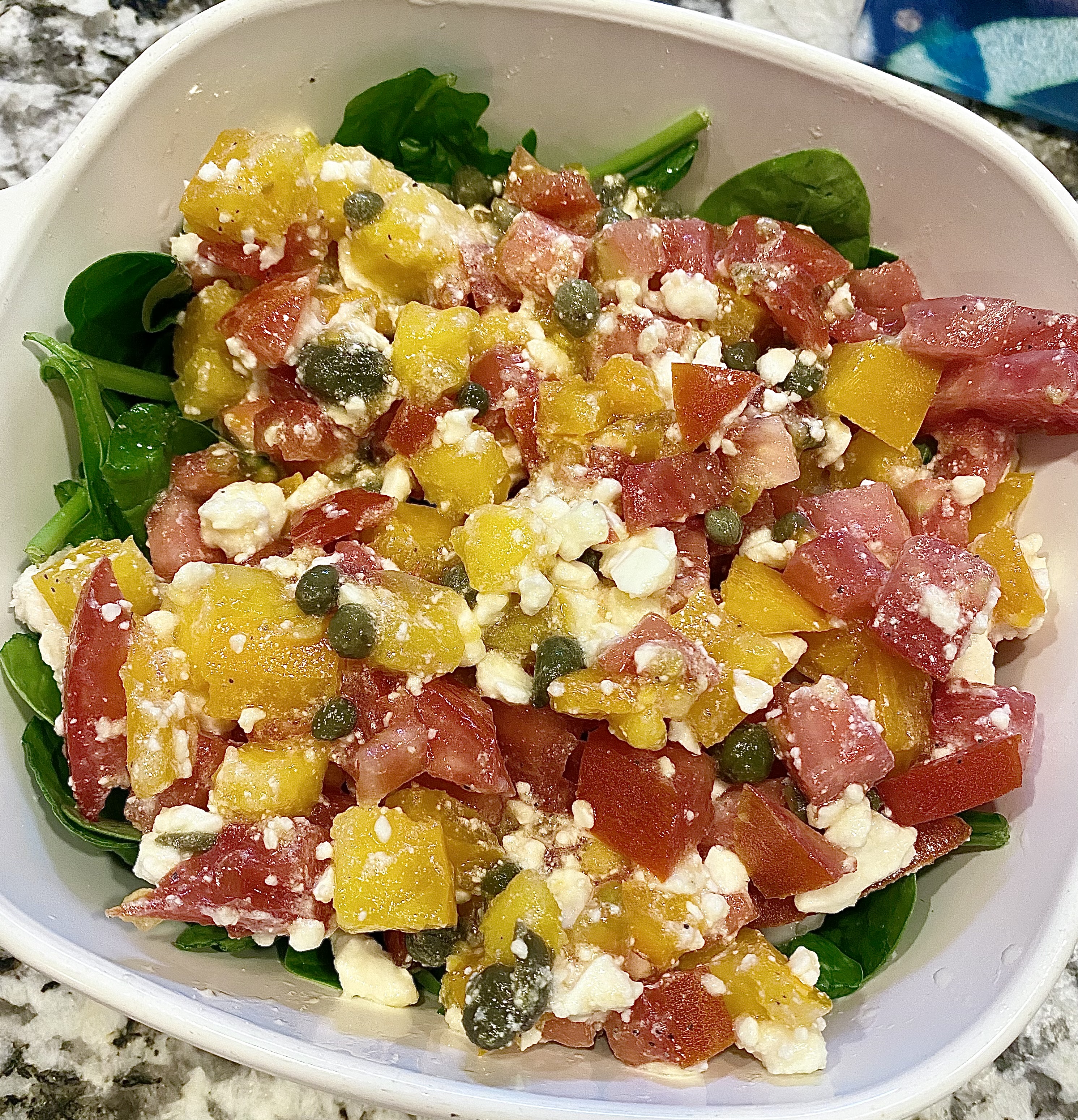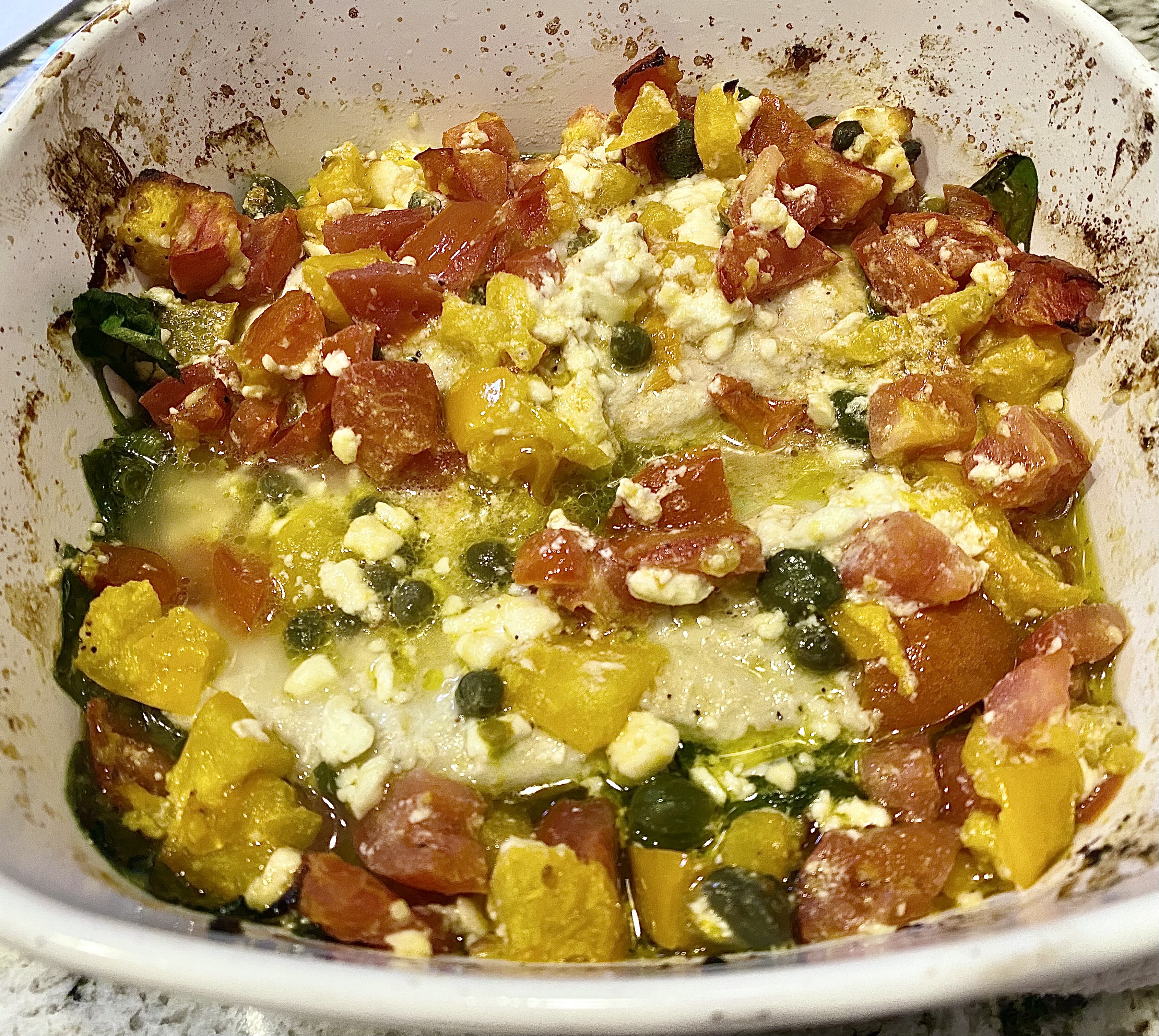 (Optional change – take out the capers and finish with basil to be more like the original tiktok and stay in the Italian flavors vs the Greek flavors. Also, this would be amaaaazing with a white fish, and just adjust cooking time.)