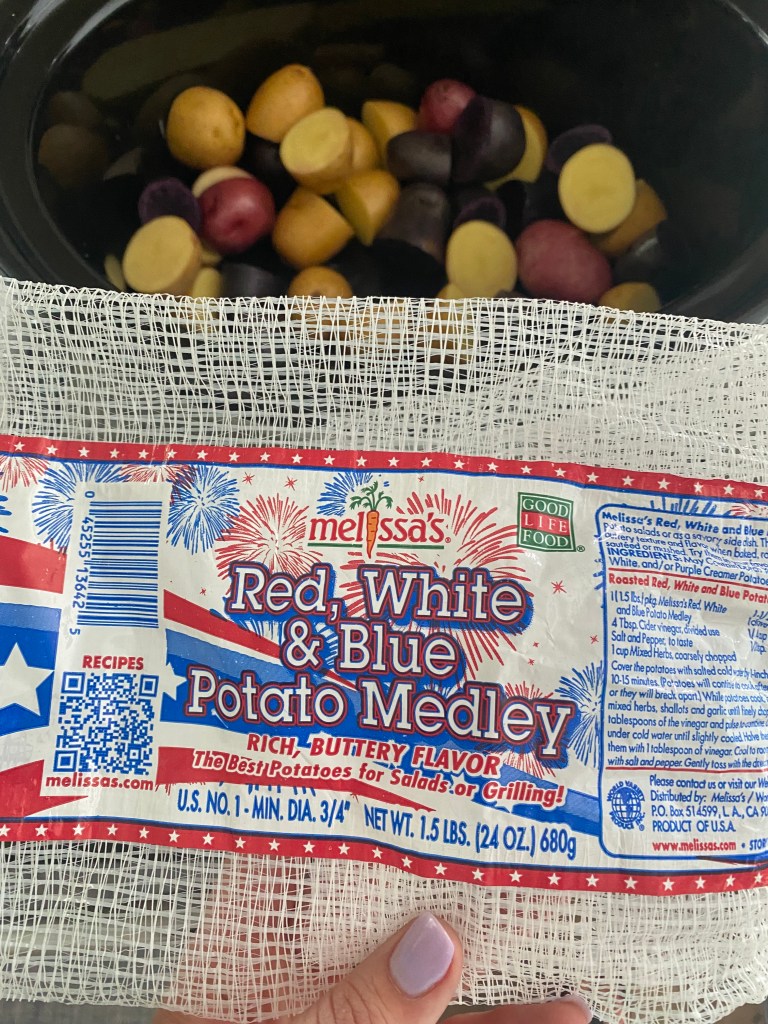 Into slow cooker add: water, beer, Old Bay Seasoning, and potatoes.